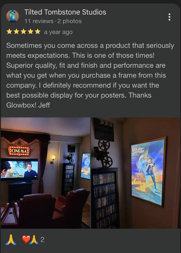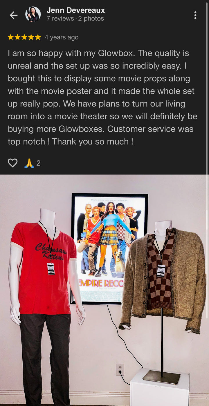 - 100% Customer Satisfaction – we turn fantasy into a reality with our "World Famous" Glowbox Poster Frames & never disappoint. A must for anyone that wants to showcase posters & art in the most creative way