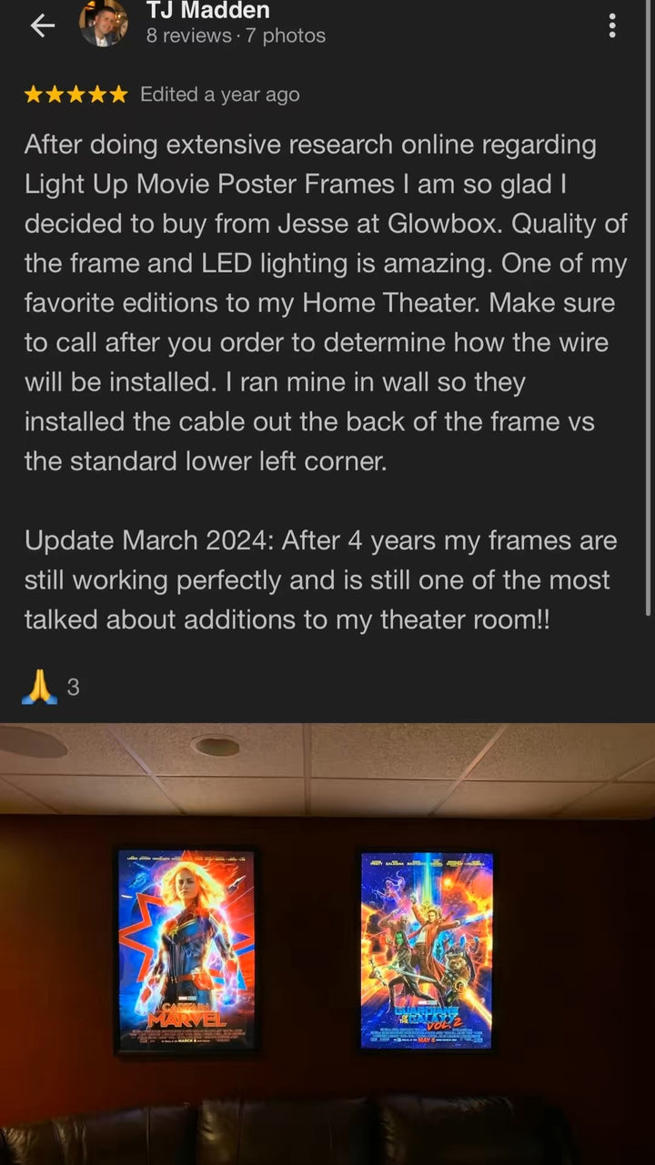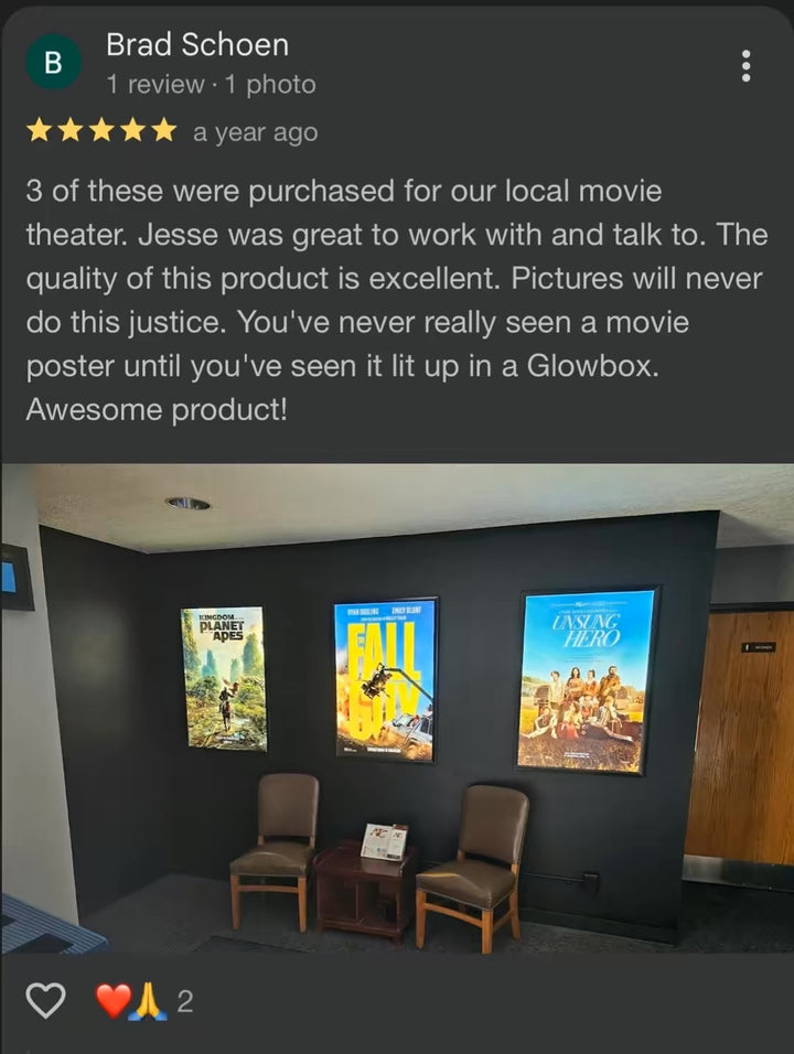 Our mission is to remain transparent at all times to you the customer with honesty, exemplary customer service and providing the most state-of-the-art products in the world. Again, our LED Glowbox Frames are designed & engineered to the exact specifications of the largest Movie Theater Chains in the world. Our company is a major supplier of some these Movie Theater Chains.